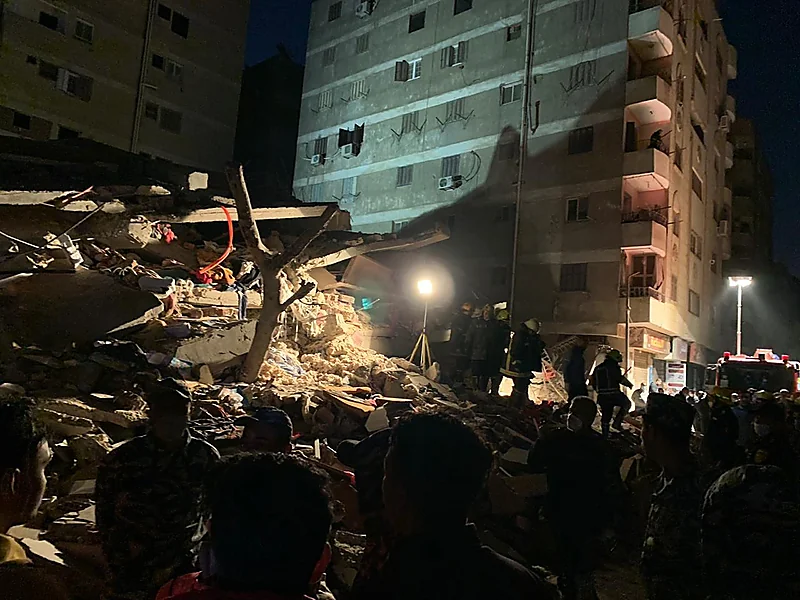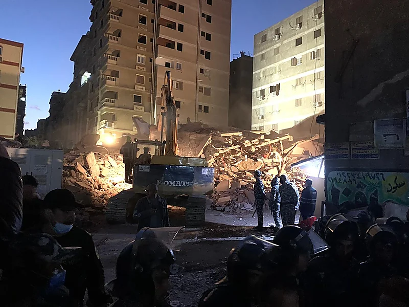 ويستمر رجال الحماية المدنية في رفع الأنقاض لإنقاذ أرواح الضحايا واستخراج الجثامين والمصابين، وجاري حصرهم.