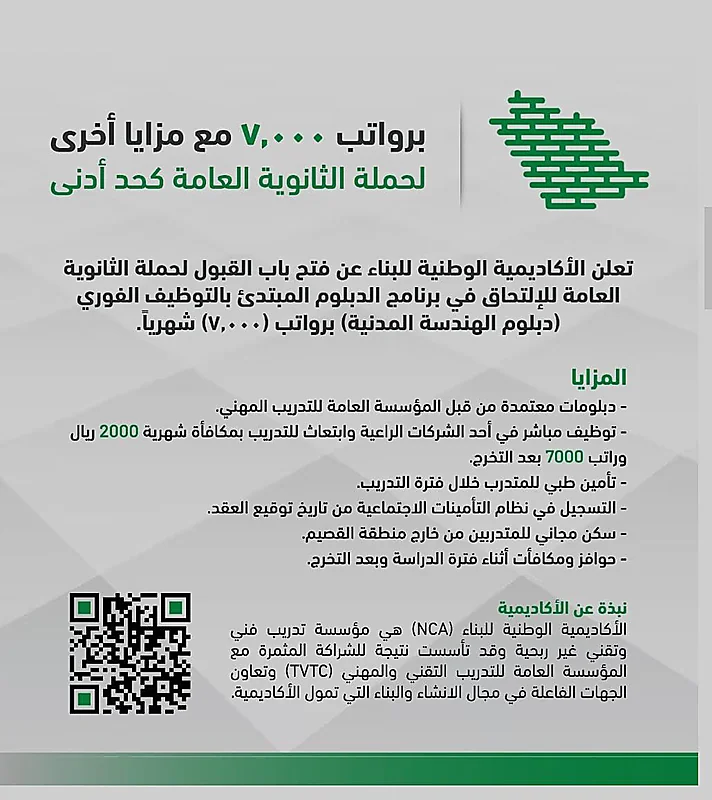 أعلنت الأكاديمية الوطنية للبناء عن فتحها باب القبول للالتحاق في برنامج الدبلوم المبتدئ بالتوظيف الفوري "دبلوم الهندسة المدنية"، بمحافظة البكيرية بالقصيم، براتب يصل لـ 7 آلاف ريال.