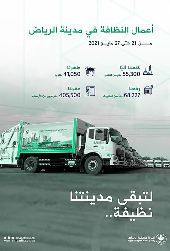 أعلنت أمانة منطقة الرياض رفعها أكثر من 68 ألف طن نفايات خلال 7 أيام، بما يعادل وزن 4000 شاحنة ثقيلة؛ حفاظًا على نظافة مدينتنا.