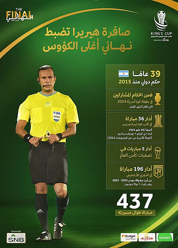أعلن الاتحاد السعودي لكرة القدم عن قيادة الحكم الأرجنتيني داريو هيريرا للمباراة النهائية على كأس الملك الذي سيجمع الهلال والنصر في ملعب الجوهرة بجدة غدًا الجمعة.