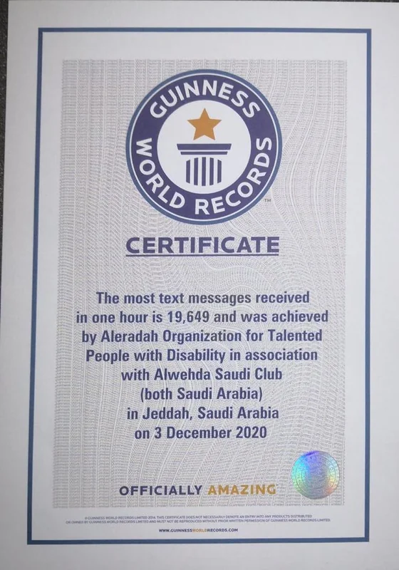 وكتب "الوحدة" عبر حسابه على "تويتر": "بدعم جماهيرنا الغالية الوحدة يدخل موسوعة غينيس للأرقام القياسية بعد تسجيل رقم قياسي بالوصول لـ 19,649 رسالة تبرع في ساعة بالمساهمة مع جمعية الإرادة في اليوم العالمي لذوي الإعاقة".