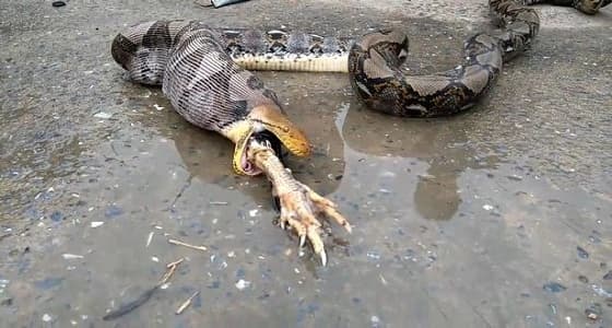 بالفيديو.. ثعبان ضخم يتقيأ ديكا سليما بطريقة مروعة