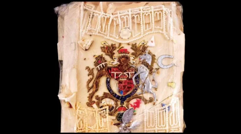والشريحة المعروضة للبيع هي من كعكة كانت مكونة من 5 طبقات، ومزينة بشعار ملكي، في الزفاف الذي أقيم سنة 1981م.