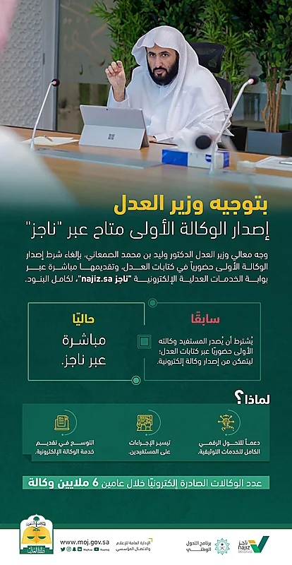 وجه معالي وزير العدل الدكتور وليد بن محمد الصمعاني، بإلغاء شرط إصدار الوكالة الأولى حضورياً من كتابات العدل، وتقديمها مباشرة عبر بوابة الخدمات العدلية الإلكترونية "ناجز هنا".