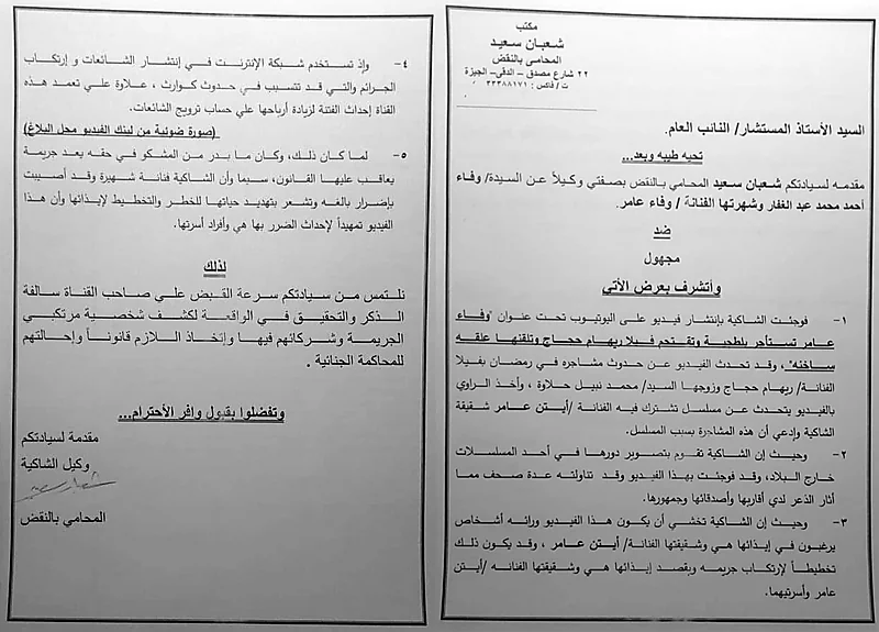 كشفت مصادر فنية أن الفنانة وفاء عامر تقدمت ببلاغ في الشرطة ضد موقع إلكتروني ادعى أن الفنانة وشقيقتها قامتا بإقتحام منزل الفنانة ريهام حجاج .