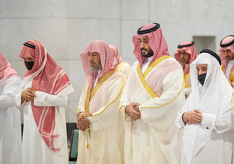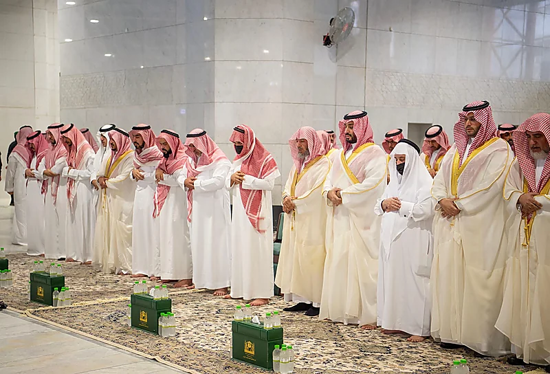 كما أدى الصلاة مع سمو ولي العهد، معالي وزير الدولة عضو مجلس الوزراء الشيخ صالح بن عبدالعزيز آل الشيخ، ومعالي عضو هيئة كبار العلماء المستشار بالديوان الملكي الشيخ الدكتور سعد بن ناصر الشثري، وأصحاب الفضيلة العلماء والمعالي وكبار المسؤولين وجموع المصلين في المسجد الحرام.